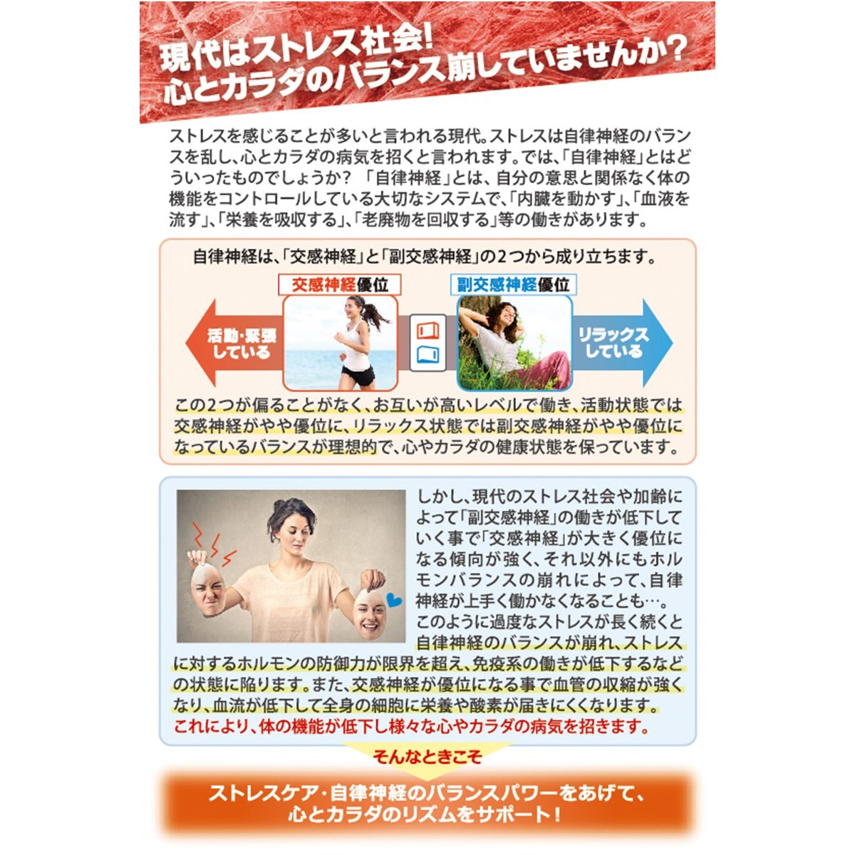 ストレスや加齢、生活のリズムなどで心と体が乱れやすい現代人をサポートし、アクティブエイジな毎日へ導きます。
