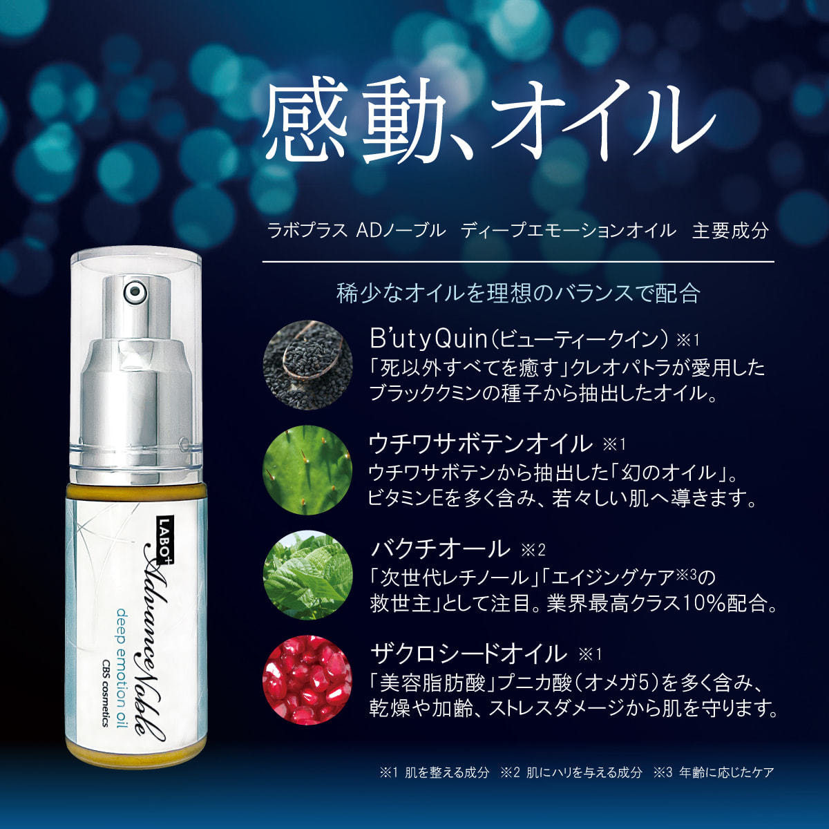 マカデミアナッツ油、バクチオール、ザクロ種子油、ニゲラサチバ種子油、オプンチアフィクスインジカ種子油、トコフェロール